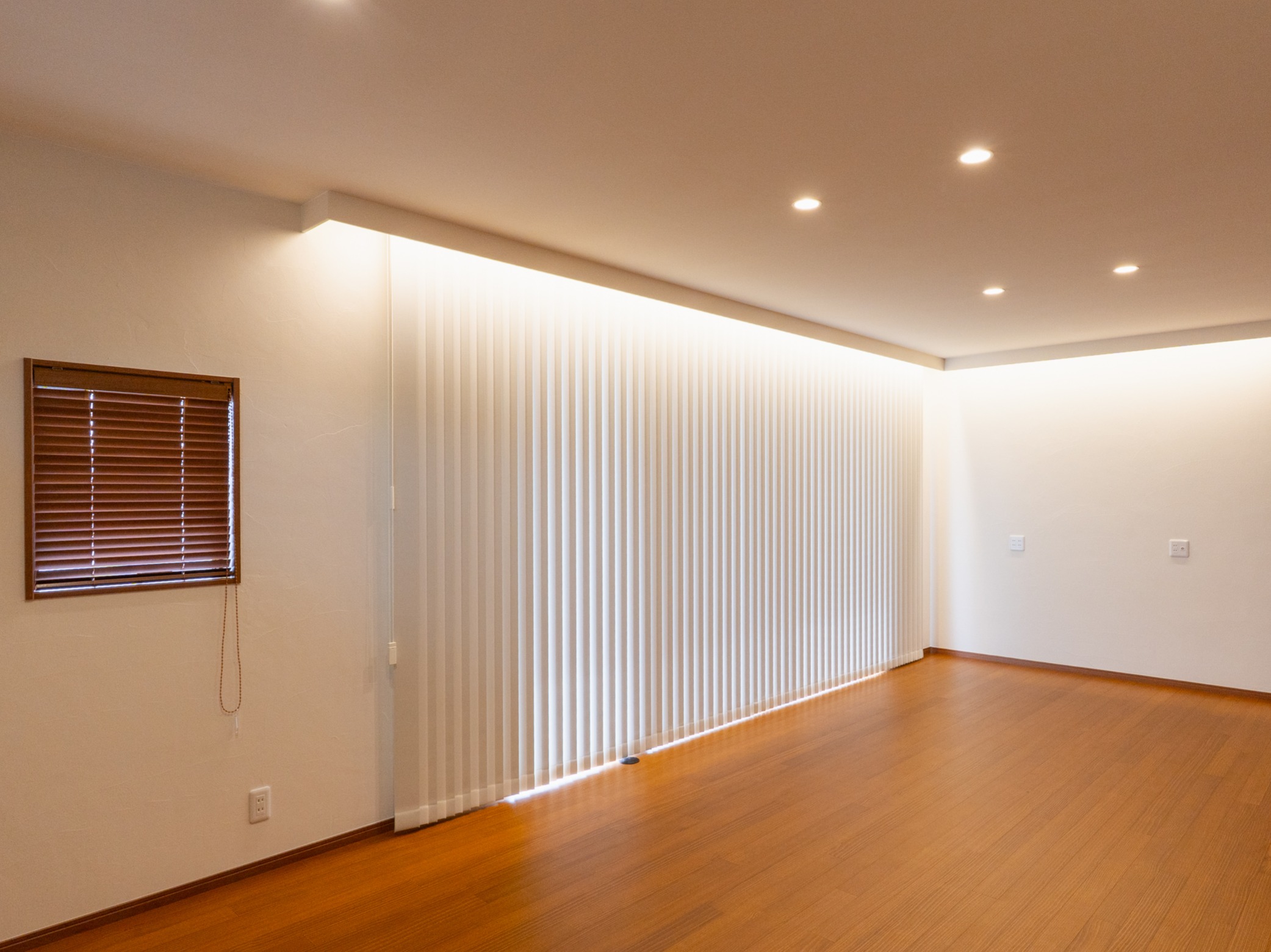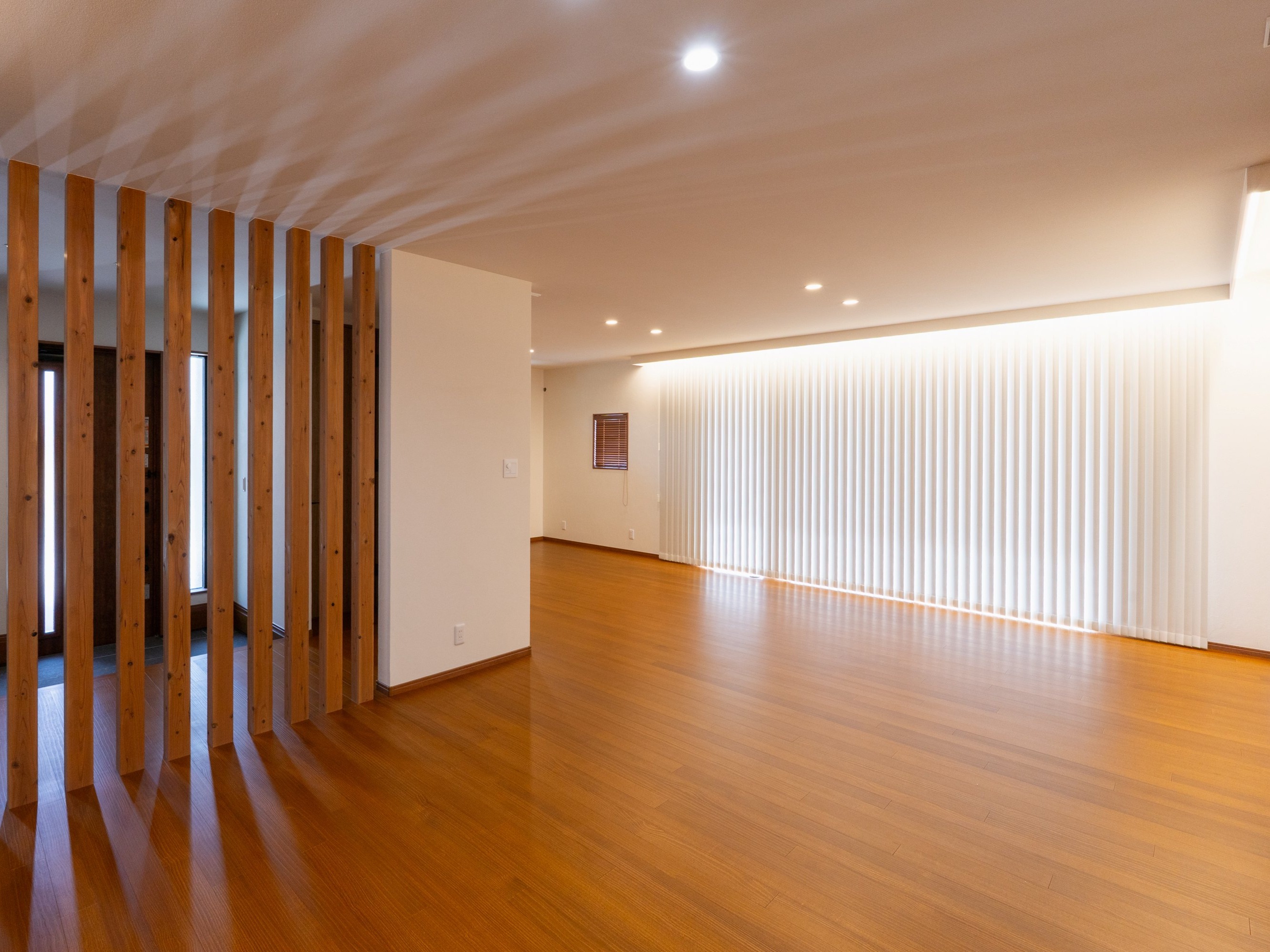 シンプルな空間に、目隠しとなる柱の縦スリットとブラインドの縦のラインが引き立つ空間となりました。