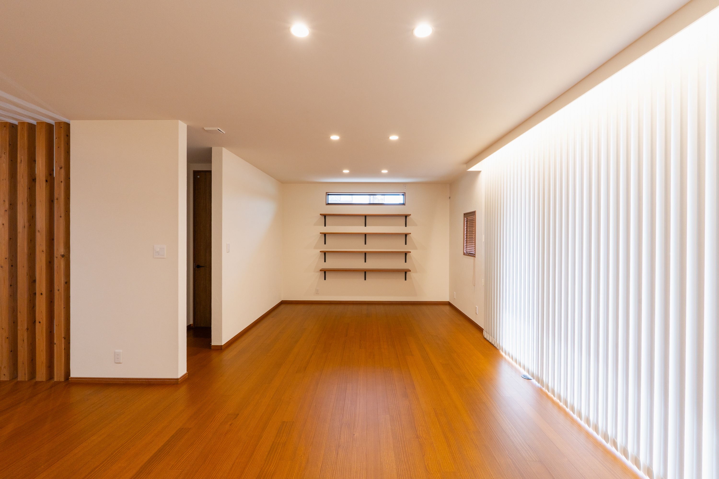 窓には、縦型のブラインド(バーチカルブラインド)を天井から床まで吊り下げました。